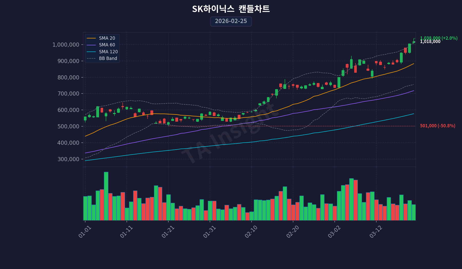 SK하이닉스 주식 가격은 최근 20일 동안 상승세를 보이며, 특히 볼린저밴드 상단을 돌파하는 등 강한 상승 추세를 나타냈습니다. 이러한 시장 동향과 함께 외국인 투자자가 3일 연속으로 순매수하고 있는 양상이 관찰됩니다.
