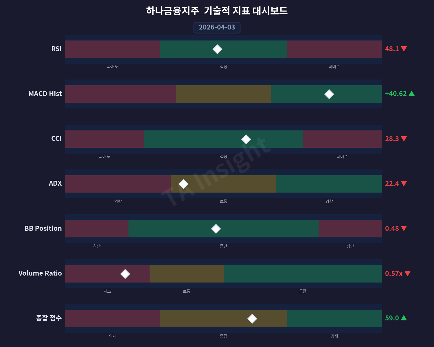 최근 5일 동안 외국인 투자자들은 순매도했지만 기관 투자자들의 매수가 지속되고 있는 모습이 관찰됩니다. 단, 하나금융지주(086790)에서 감지된 기술적 이벤트는 MACD 추세 전환으로 나타났으며, 이는 상향 반전을 시사하는 긍정적인 신호입니다.