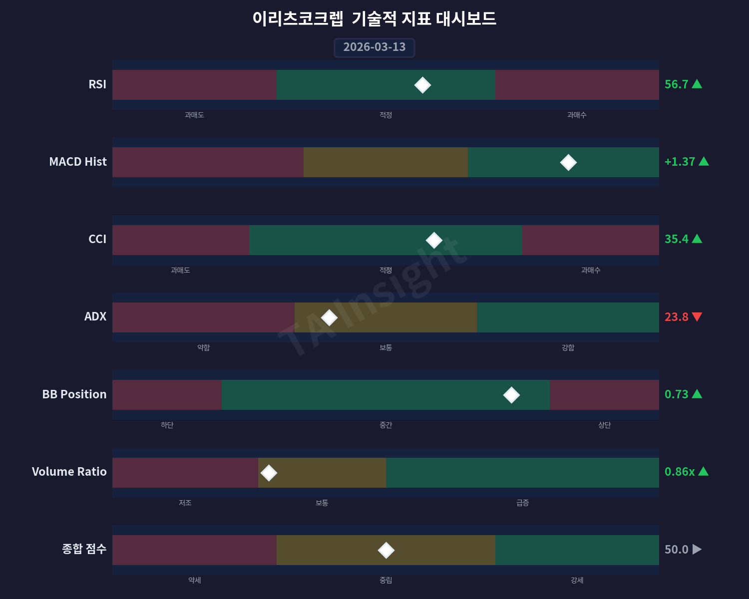 이리츠코크렙(088260)은 최근 20일간 가격 변동폭이 작게 유지되며 보합세를 나타냈지만, 거래량 증가 추세는 시장의 관심도가 높아졌음을 시사합니다. RSI 지표값은 상승하는 경향을 보이며 MACD 역시 상향 추세에 있습니다.
