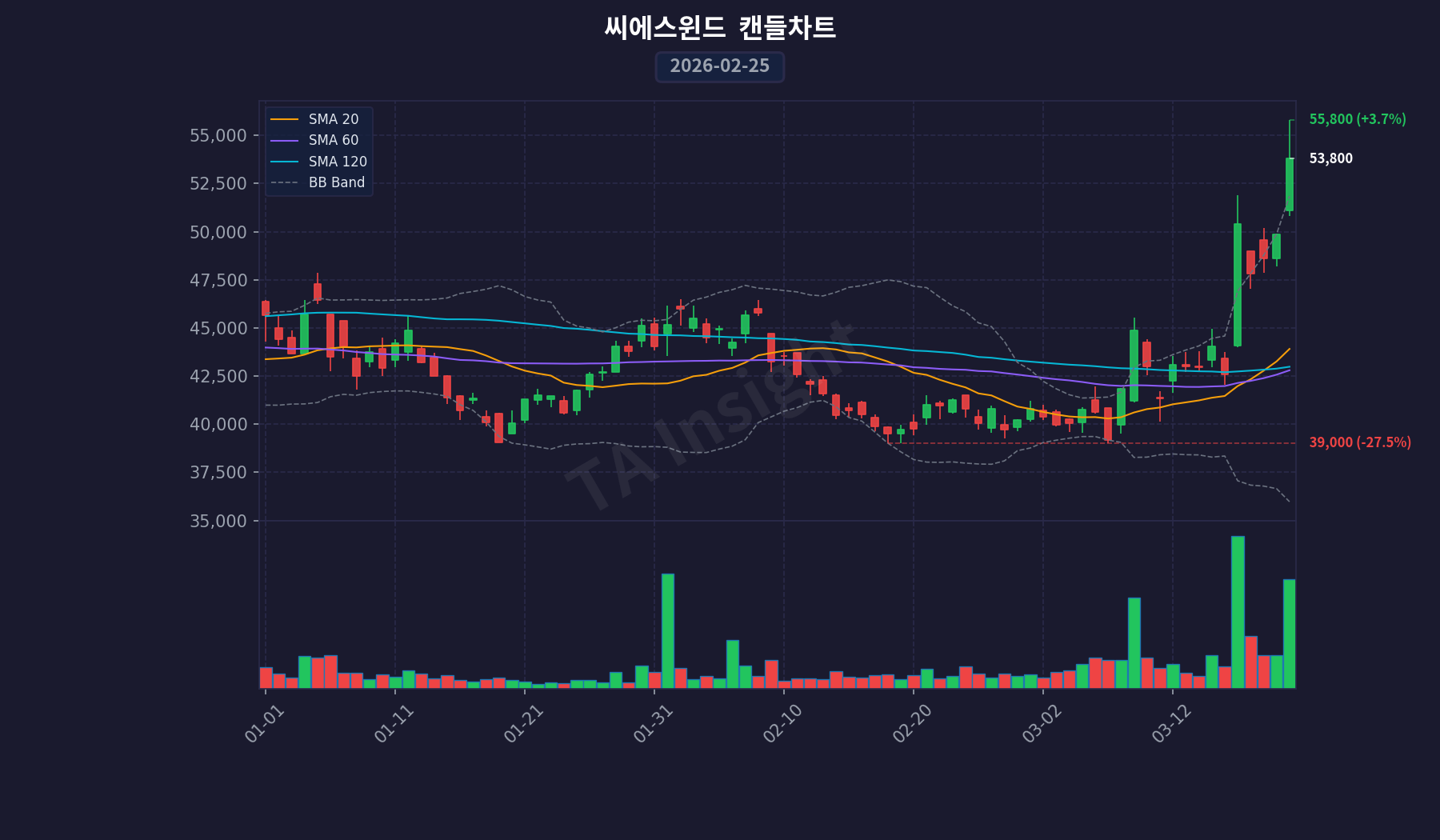 씨에스윈드(112610)의 최근 주가는 지난 20일 동안 상승세를 보이며, 거래량 또한 증가 추세입니다. RSI와 MACD 지표 역시 상승추세를 나타내고 있습니다.