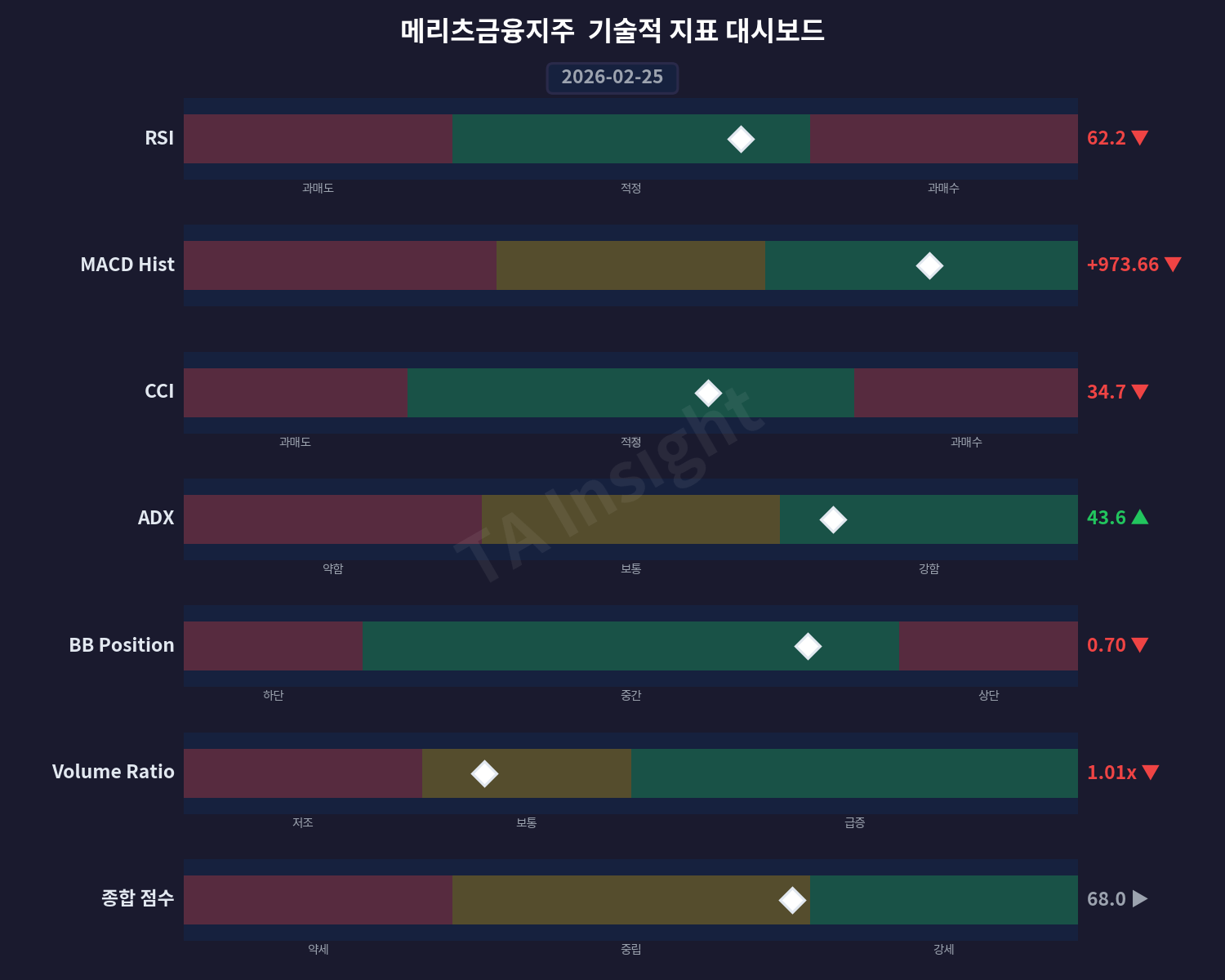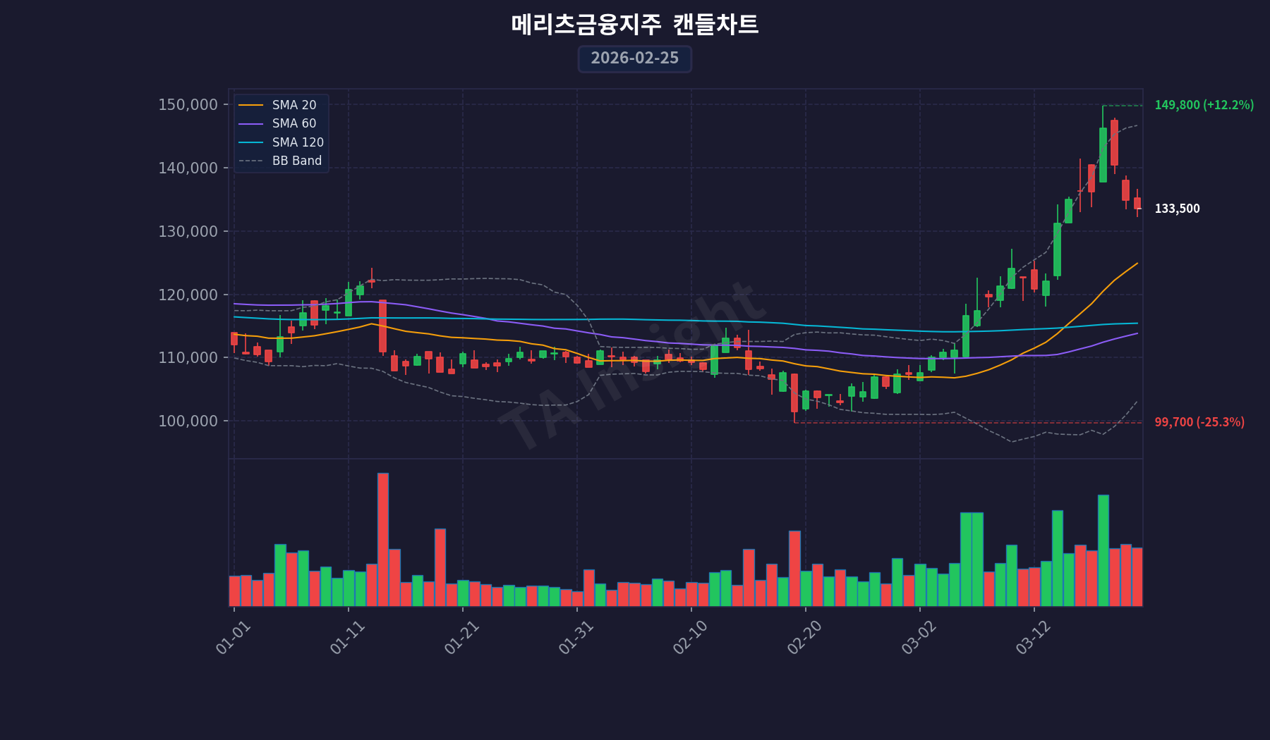 메리츠금융지주(138040)의 최근 주가는 지난 20일간 상승했으며, 이 기간 동안 거래량 또한 증가하는 추세를 보이고 있습니다. RSI와 MACD 지표 모두 상승 트렌드를 나타내고 있으며, 외국인과 기관들의 순매수세도 확인됩니다.