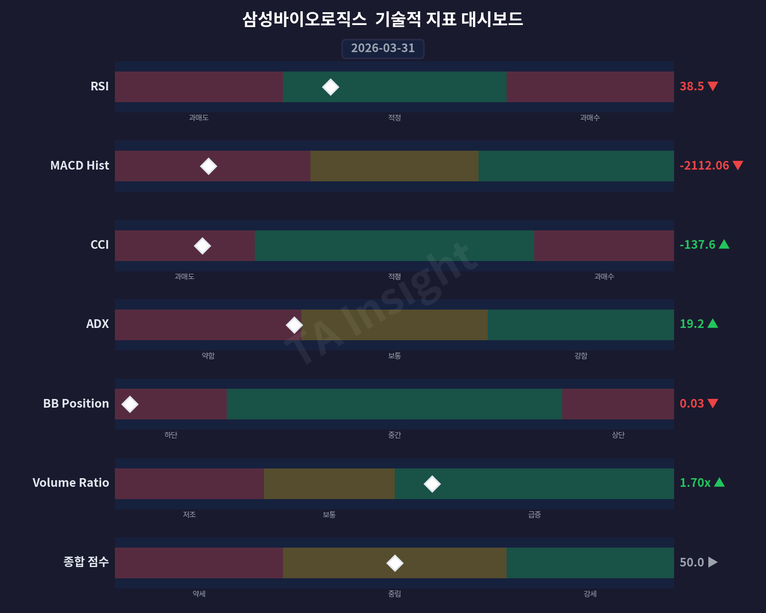 삼성바이오로직스의 주가는 최근 20일 동안 약 -9.2% 하락하며 거래량도 감소하는 모습을 보이고 있습니다. RSI 지표값은 38.51으로 저위치에 머물며, MACD 역시 하향 추세를 이어나가고 있어 부정적인 시장 상황이 반영되고 있는 것처럼 관찰됩니다.