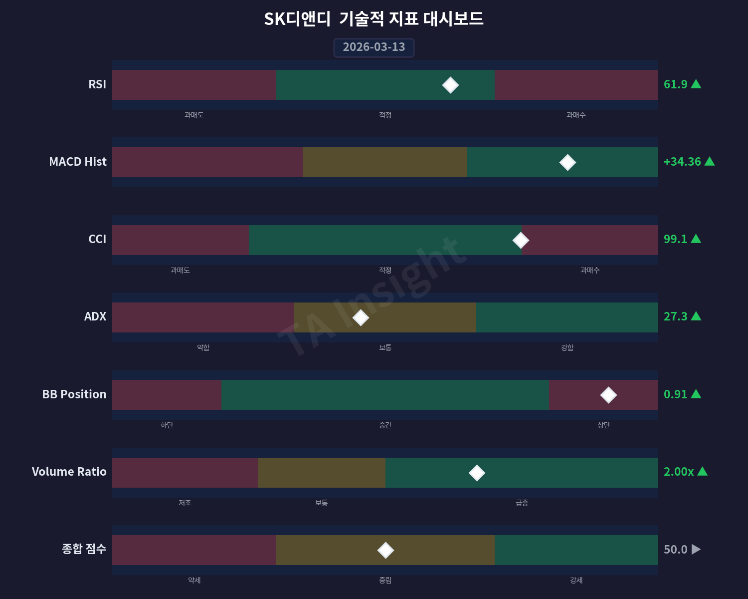 SK디앤디의 기술적 지표들은 현재 상승 추세를 나타내고 있지만, 최근 20일 동안의 가격 변화는 큰 폭의 변동 없이 보합된 상태입니다.