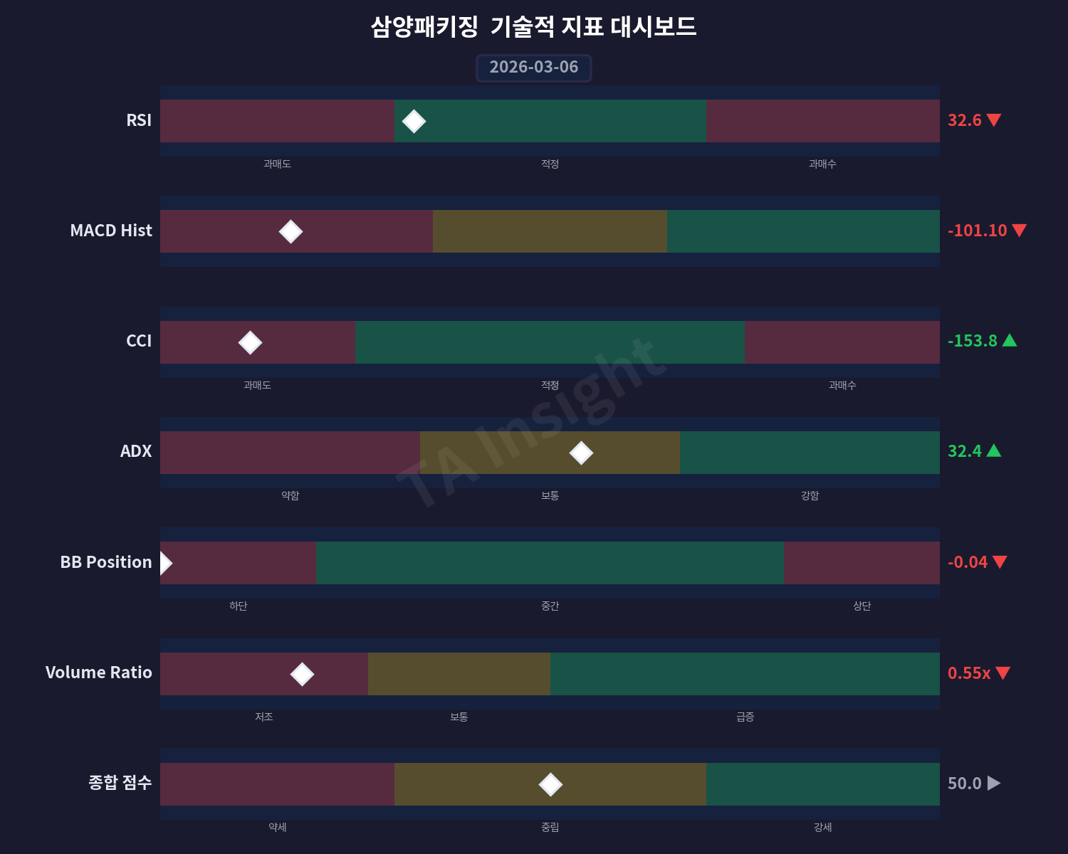 삼양패키징의 주가는 최근 20일 동안 약 -8.9% 하락세를 보이며 거래량은 증가 추세에 있습니다. RSI 지표값은 32.55로 저점 부근에서 형성되고 있으며, MACD 역시 DOWN 트렌드를 유지하고 있습니다.