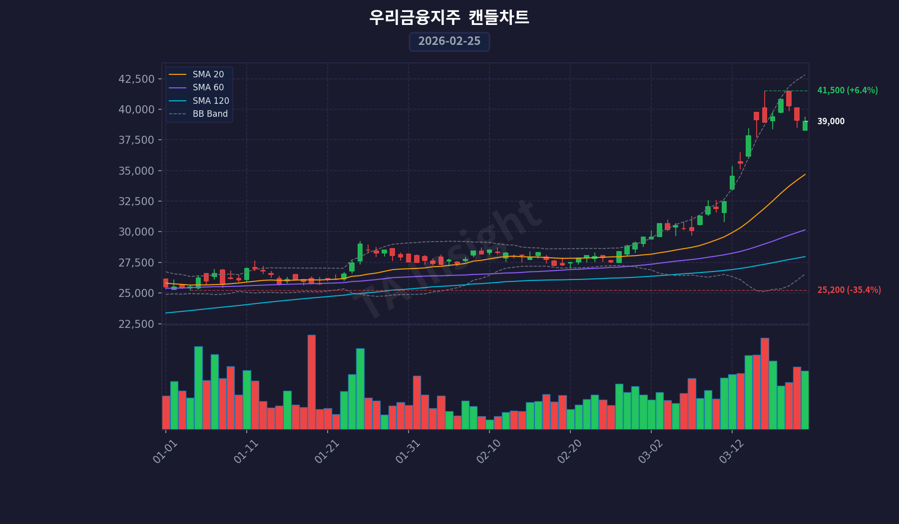 우리금융지주(316140)는 최근 20일간 가격 상승과 함께 거래량 증가를 보이고 있습니다. RSI 지표값은 75.94로 높게 나타나며, MACD 역시 UP 추세을 유지하고 있어 시장의 전반적인 분위기는 상승적입니다.