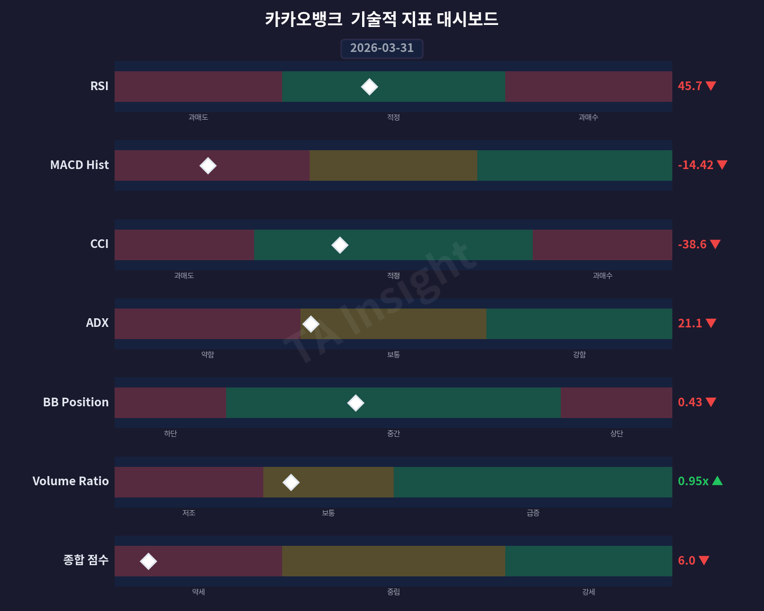 카카오뱅크 주식은 최근 20일간 가격 변동폭이 작아 보합세를 나타냈으며, 거래량 또한 감소하는 경향을 보이고 있습니다. RSI는 중립적인 수준(45.66)이며, MACD 지표는 하향 추세를 이어가고 있습니다.