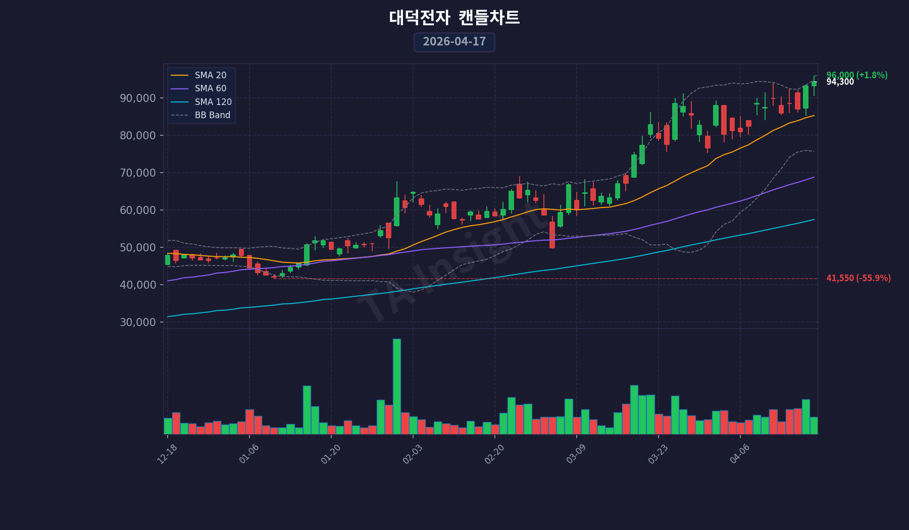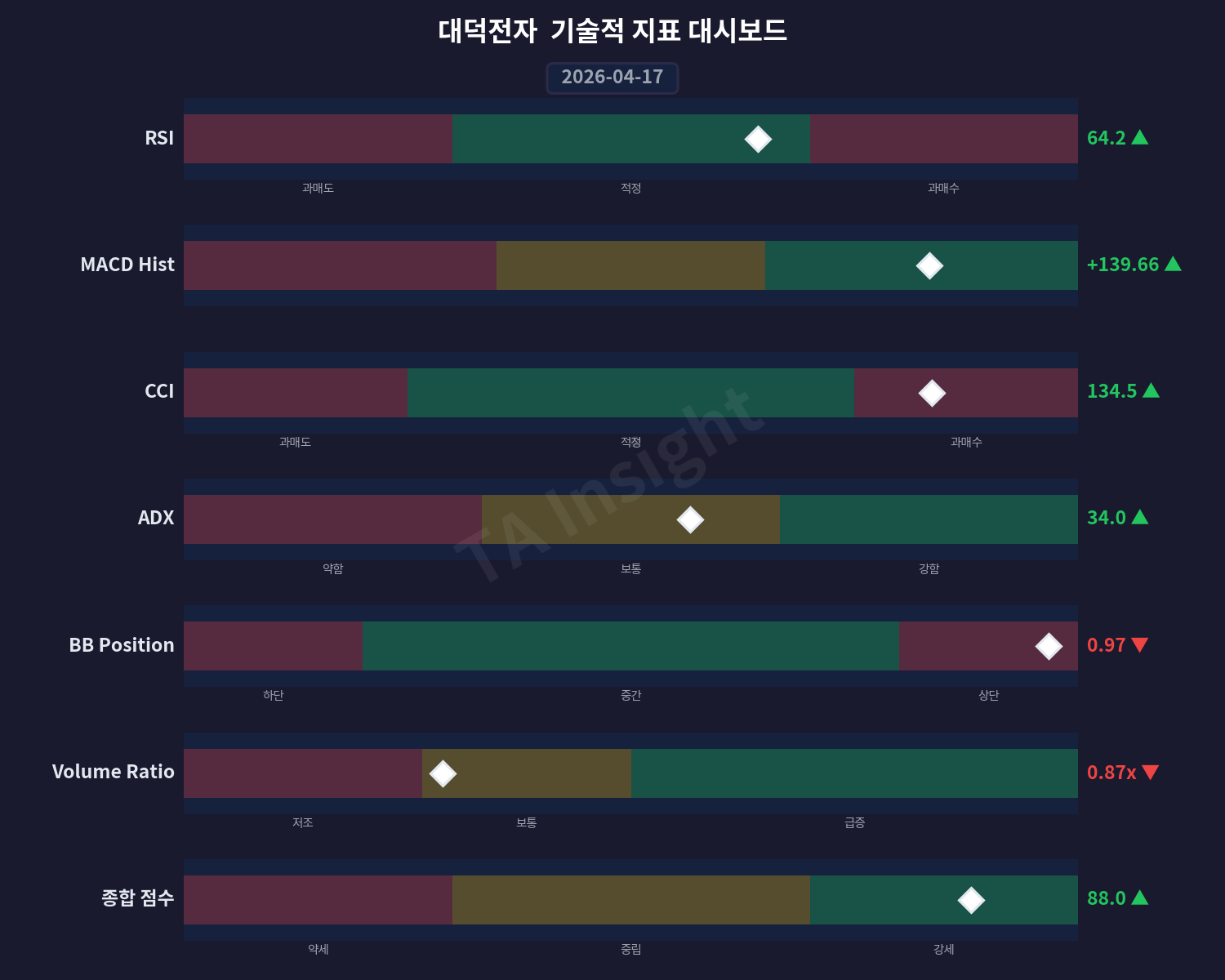 결론적으로 대덕전자(353200) 주식의 최근 기술적 변화와 흐름을 종합해볼 때, 상승세가 지속될 가능성은 있지만 과매수 상태에 가까워지고 있는 점과 거래량 감소 추세를 고려해야 합니다.
