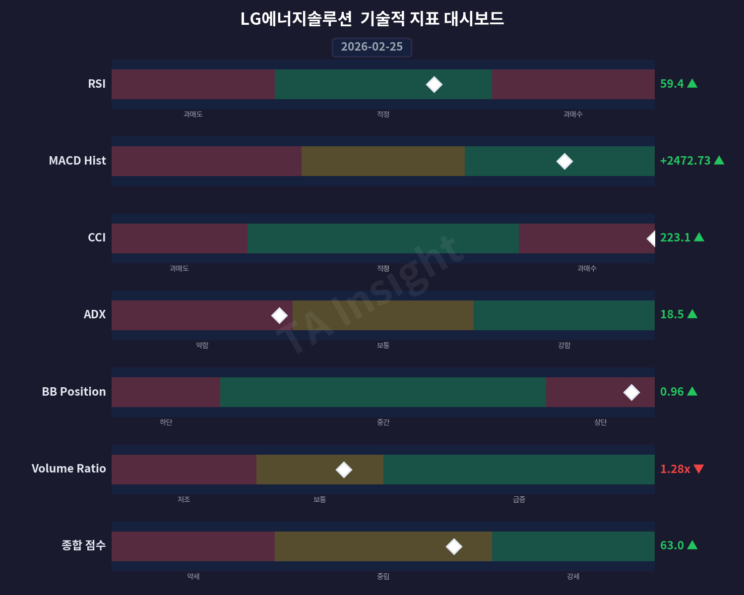 LG에너지솔루션(373220) 주식 가격은 최근 20일 동안 상승세를 보이며, 거래량 또한 유지되고 있습니다. RSI 지표는 59.37로 나타나며 MACD 역시 UP 추세입니다.