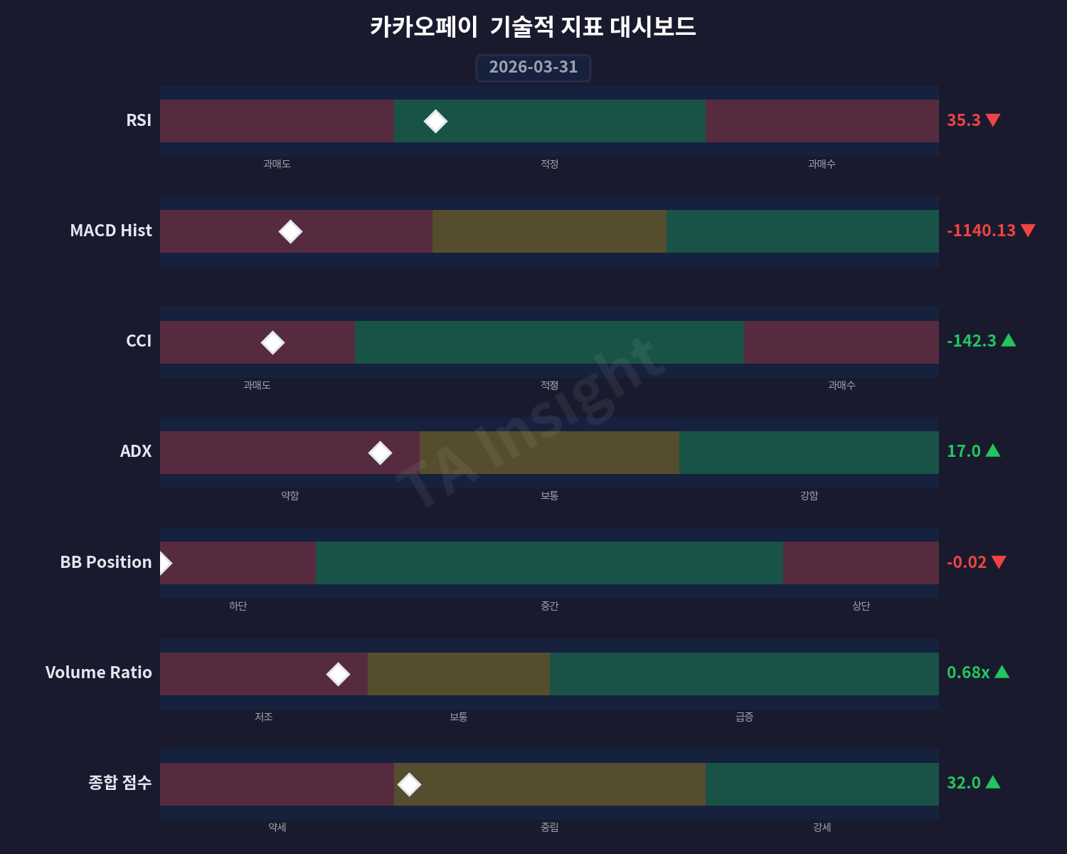 카카오페이 주식 가격은 최근 20일 동안 약 -19%의 하락세를 보이며 거래량 또한 감소 추세입니다. RSI는 35.31로 저위치에 머물며, MACD 역시 DOWN 트렌드를 나타내고 있습니다.