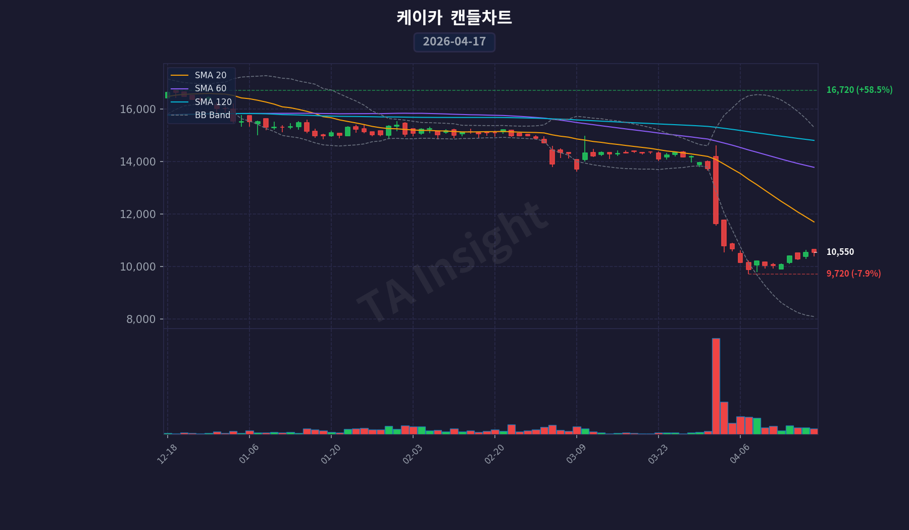 케이카(381970)는 최근 20일 동안 가격은 하락하여 -24.4%의 손실을 보였다.