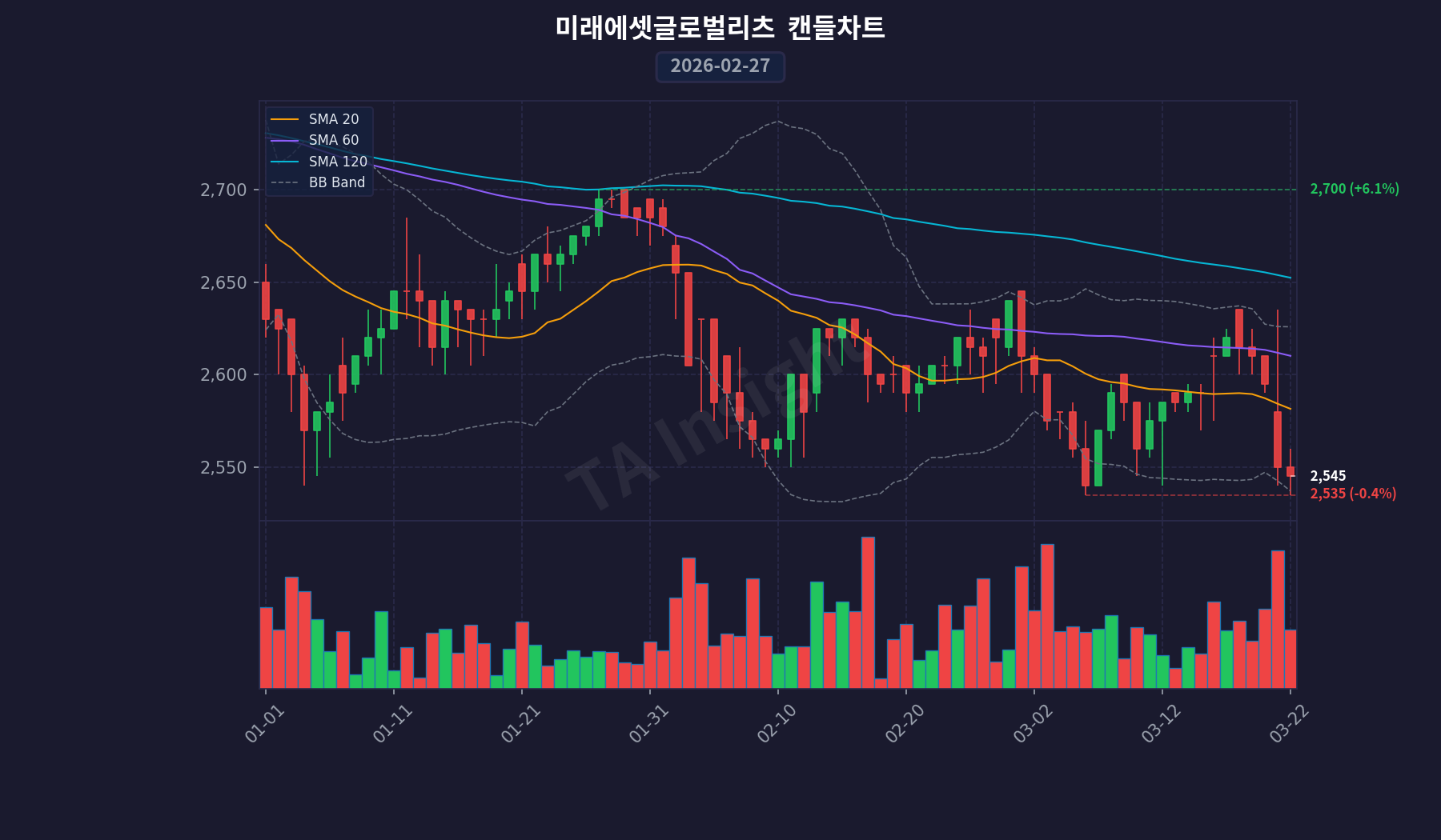 미래에셋글로벌리츠(396690)의 최근 20일간 가격은 보합세를 나타내며, -1.2% 변동했습니다. 거래량은 증가 추세이며, RSI는 40.80으로 저평가 영역에 머물고 있습니다.