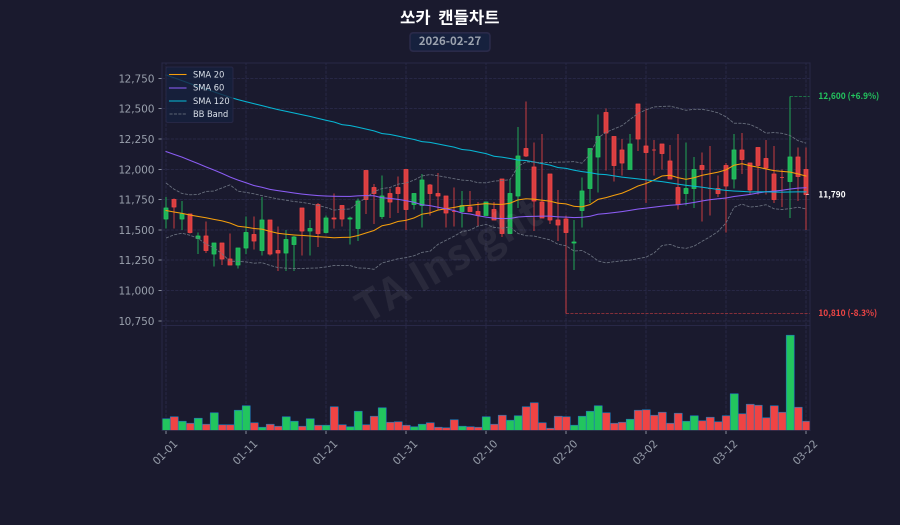 쏘카(403550)의 최근 20일 가격 변동은 거의 없으며, -0.1%로 소폭 보합된 상태입니다. 하지만 거래량 증가 추세는 주목할 만합니다.