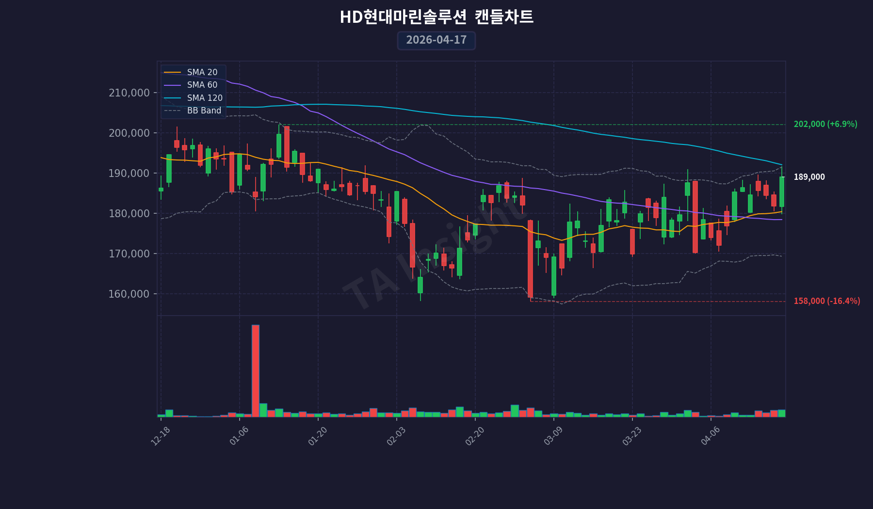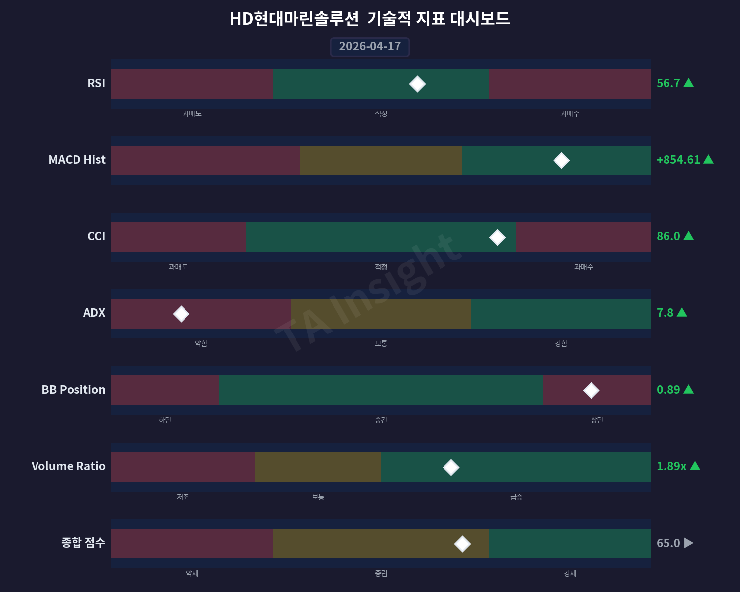 HD현대마린솔루션(443060)의 주가는 최근 20일 동안 상승세를 보이며, 가격은 약 6% 증가했습니다. 거래량은 유지되고 있으며, RSI 지표는 현재 56.72로 나타나 과매수 상태에 이르지는 않았습니다. MACD 지표 또한 UP 추세를 보이고 있습니다. 최근 5일간 외국인들은 순매수 세력을 보였지만, 기관은 순매도 세력으로 관찰되었습니다. 외국인의 매수가 7일 연속 진행되고 있는 상황이 나타났습니다.