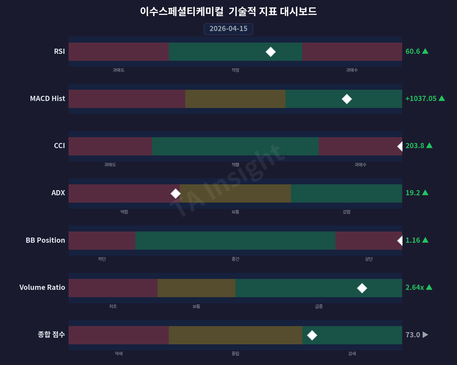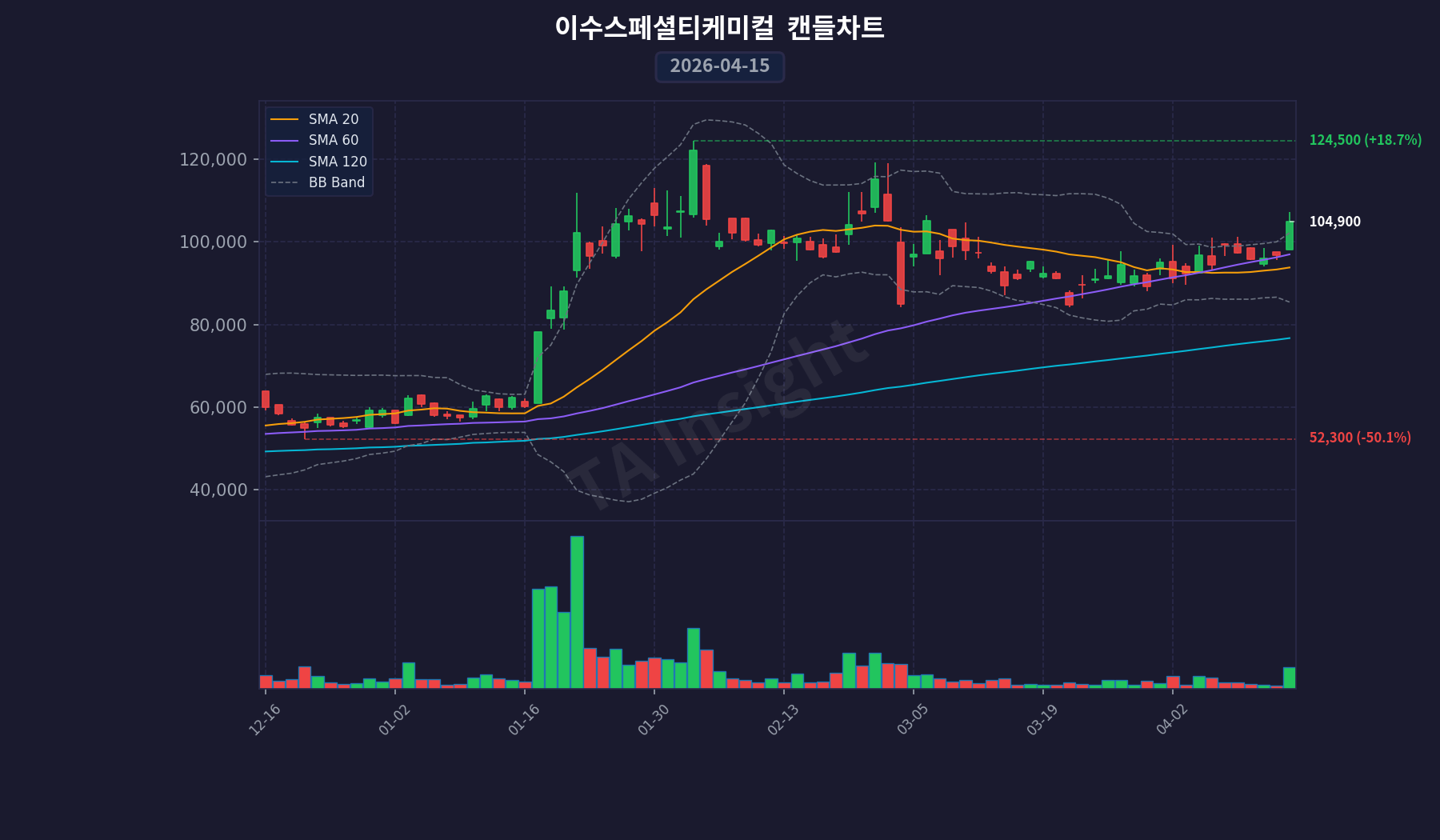 이수스페셜티케미컬 주식은 최근 20일 동안 가격상승세를 보이며 약 14.4%의 상승폭을 기록했습니다.
