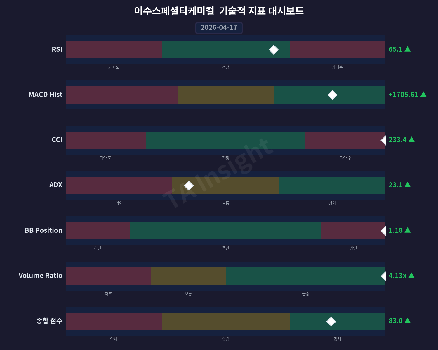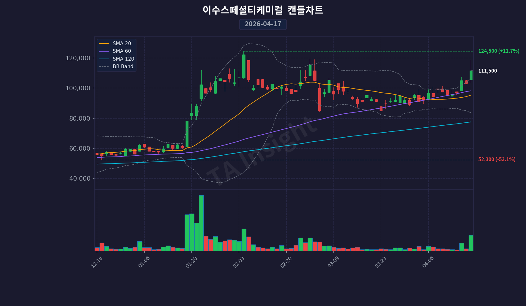 이수스페셜티케미컬(457190)의 최근 주가는 볼린저밴드 상단을 돌파하며 상승세를 보이고 있습니다. 최근 20일 동안 가격은 약 21.5% 상승했으며, 이 기간동안 거래량 또한 증가하는 추세입니다.