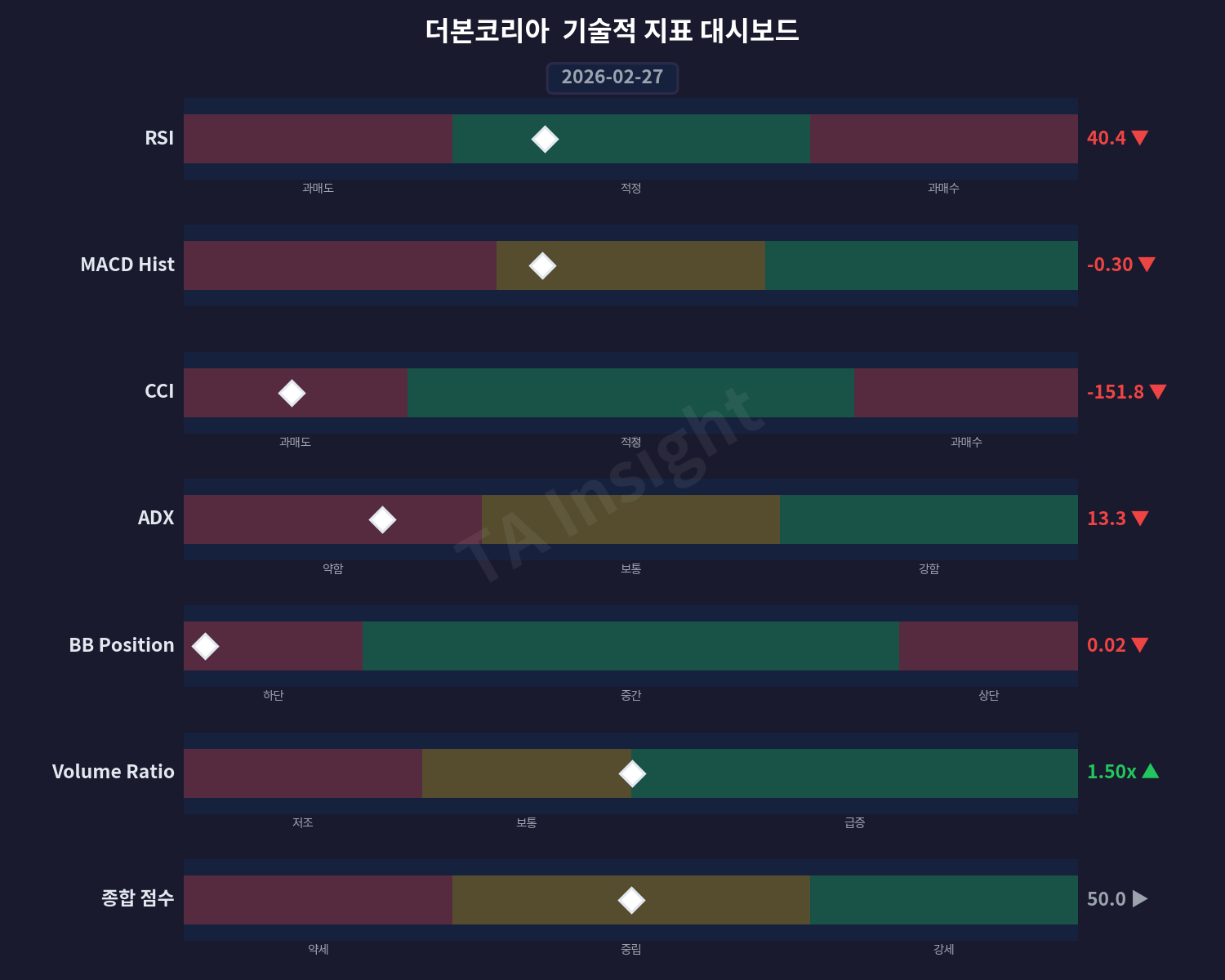 더본코리아(475560)는 최근 20일간 가격은 약 -1.5%의 보합세를 나타냈으며, 거래량은 증가하는 추세입니다. RSI 지표값은 33.15로 저평가 상태에 머물고 있습니다.