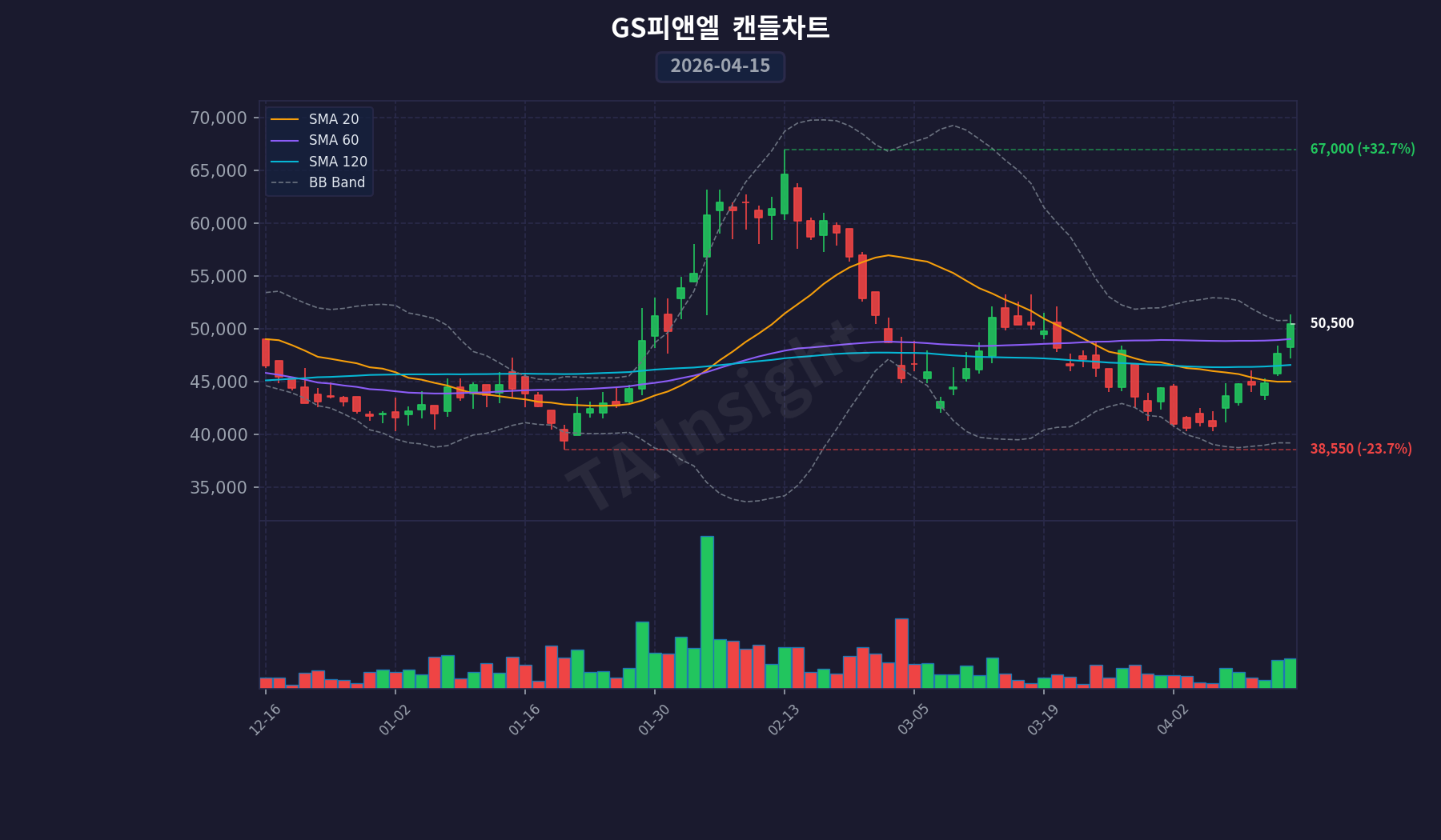 GS피앤엘(499790)의 최근 20일간 가격은 상승하고 있으며, 이 기간 동안 거래량은 감소하는 경향을 보이고 있습니다. RSI 지표는 현재 59.91로 나타나며 MACD 지표는 상승 추세를 유지하고 있습니다.