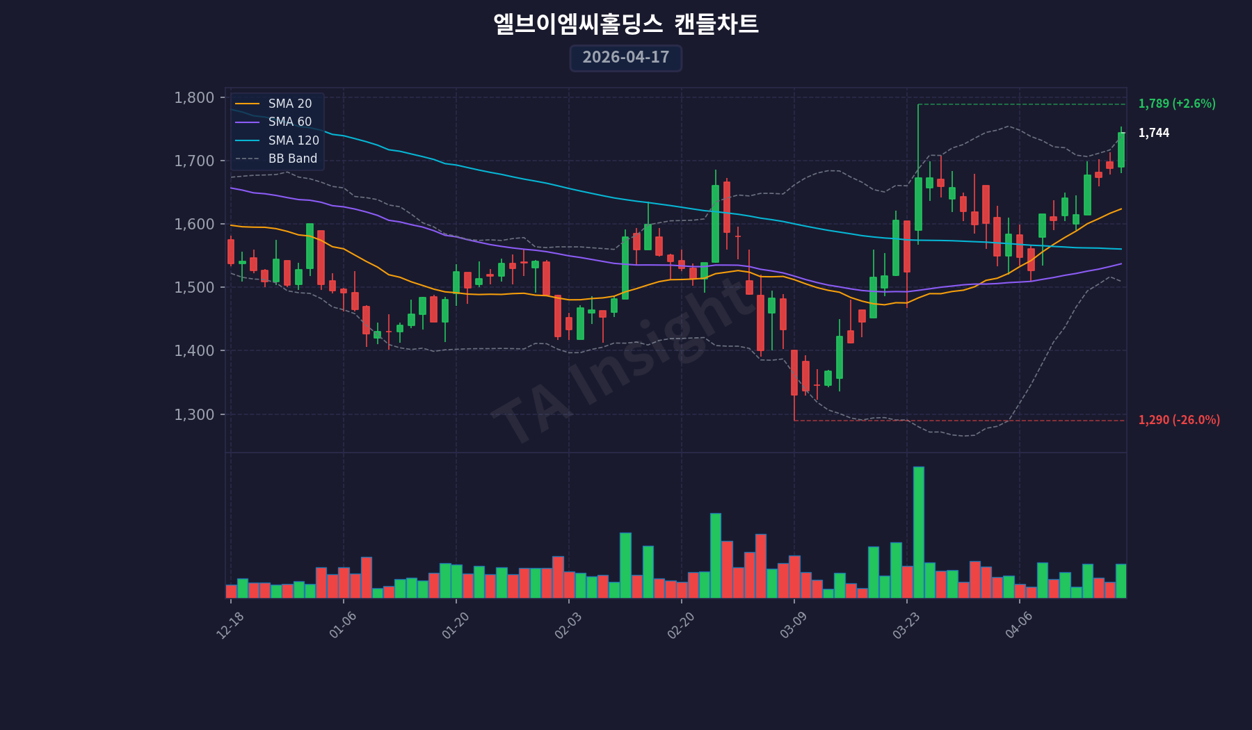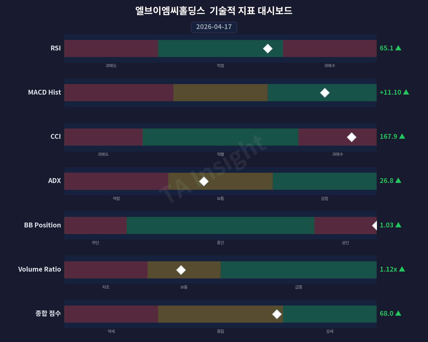 최근 이벤트와 동향들을 종합해보면, 현재 엘브이엠씨홀딩스 주식의 시장 상황은 상승세를 유지하면서도 매수 심리 약화 가능성과 중립적인 추세 전환을 보이고 있습니다.